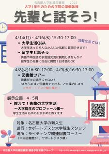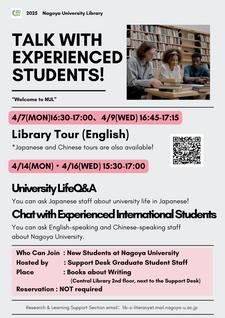 The Central Library Support Desk provides learning support from graduate student staff in Japanese, English, and Chinese on weekdays from 3:00 PM to 7:00 PM.At "Talk with Experienced Students!", senior international students will introduce how to use the library and share insights about student life at Nagoya University. They will also answer any questions you may have.Make the most of this opportunity to prepare for your upcoming classes and student life!