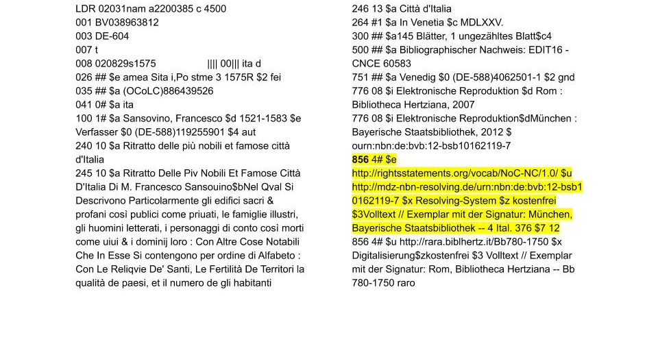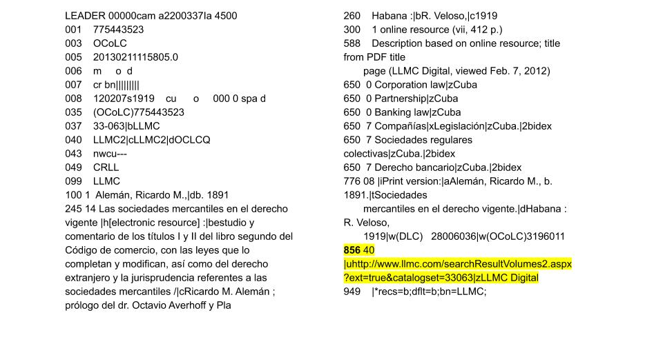 現代の目録業務によれば、デジタルサロゲートは冊子体の原本とは別の書誌レコードに記述されるべきです。それぞれの組織の実情によっては、デジタルサロゲートと冊子体の別々のレコードは、776フィールド(下記のGPOの例を参照のこと)を介して互いに参照することができ、856 41は、デジタルサロゲートのURLおよびプログラムソース(例:Google Books、HathiTrust)を表すために、いずれか一方または両方のレコードで使用されます。以前の目録業務では、別々のレコードを作成するのではなく、冊子体レコードの856フィールドをデジタルサロゲートを表すために用いていました。