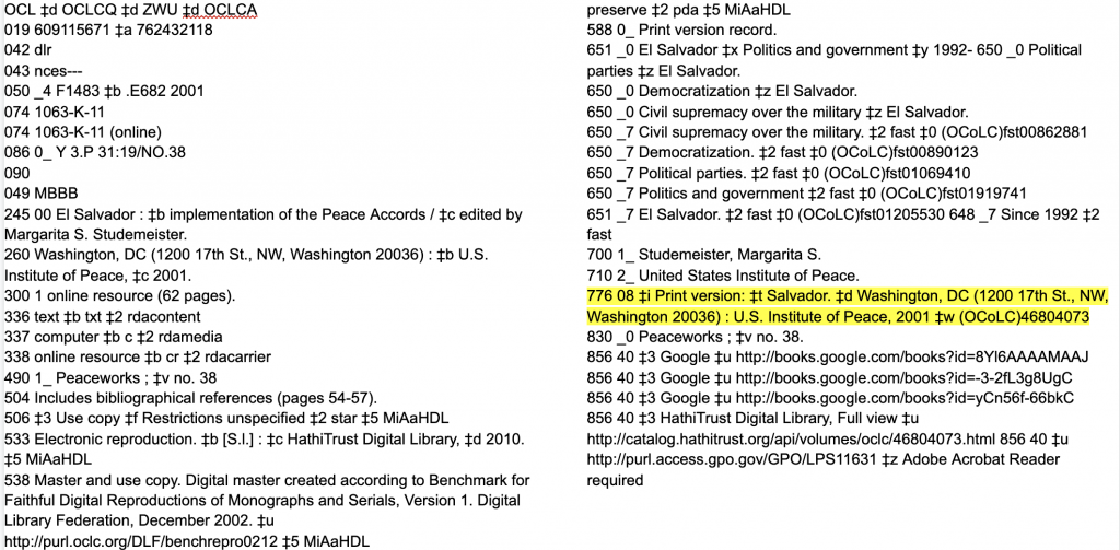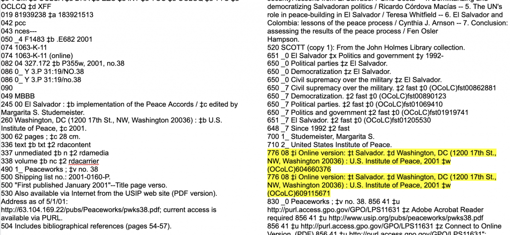 複数のGPOリンクとオンラインレコードへの2つの776フィールドを持つ、OCLC #46804073の冊子体レコード。冊子体レコード内の2つの776の存在と、レコード間のリンクの相違は、作成されるレコードを維持することの問題の一部を示しています。 (pdf)