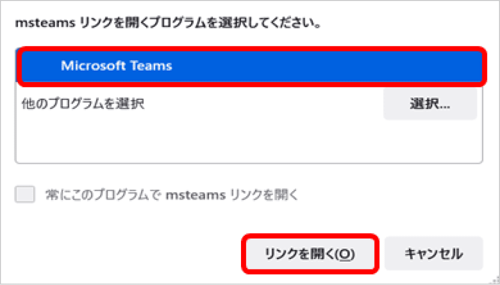 2. Microsoft Teamsを選択した状態で「リンクを開く」をクリックしてください。