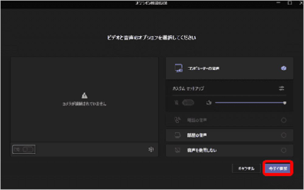 3. 会議画面が立ち上がるので、設定を確認して「今すぐ参加」をクリックして会議に参加してください。