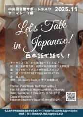 日本語を勉強している留学生の皆さんにおすすめのイベントです。大学院生スタッフや参加者のみなさんと気軽に日本語でおしゃべりしませんか?日本語に自信がなくてもOKで