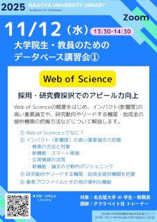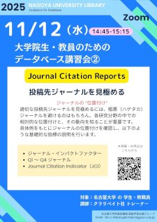 大学院生・教員の方へおすすめの、①文献データベース:Web of Science、②学術誌評価データベース:Journal Citation Reports の講習会です。