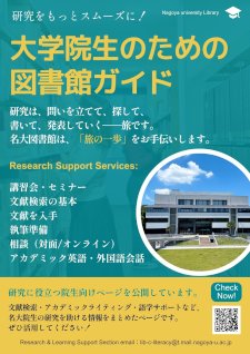 大学院生向けの図書館情報をまとめました。受けられるサービスなど、初めて名大図書館を利用される方におすすめのガイドです。